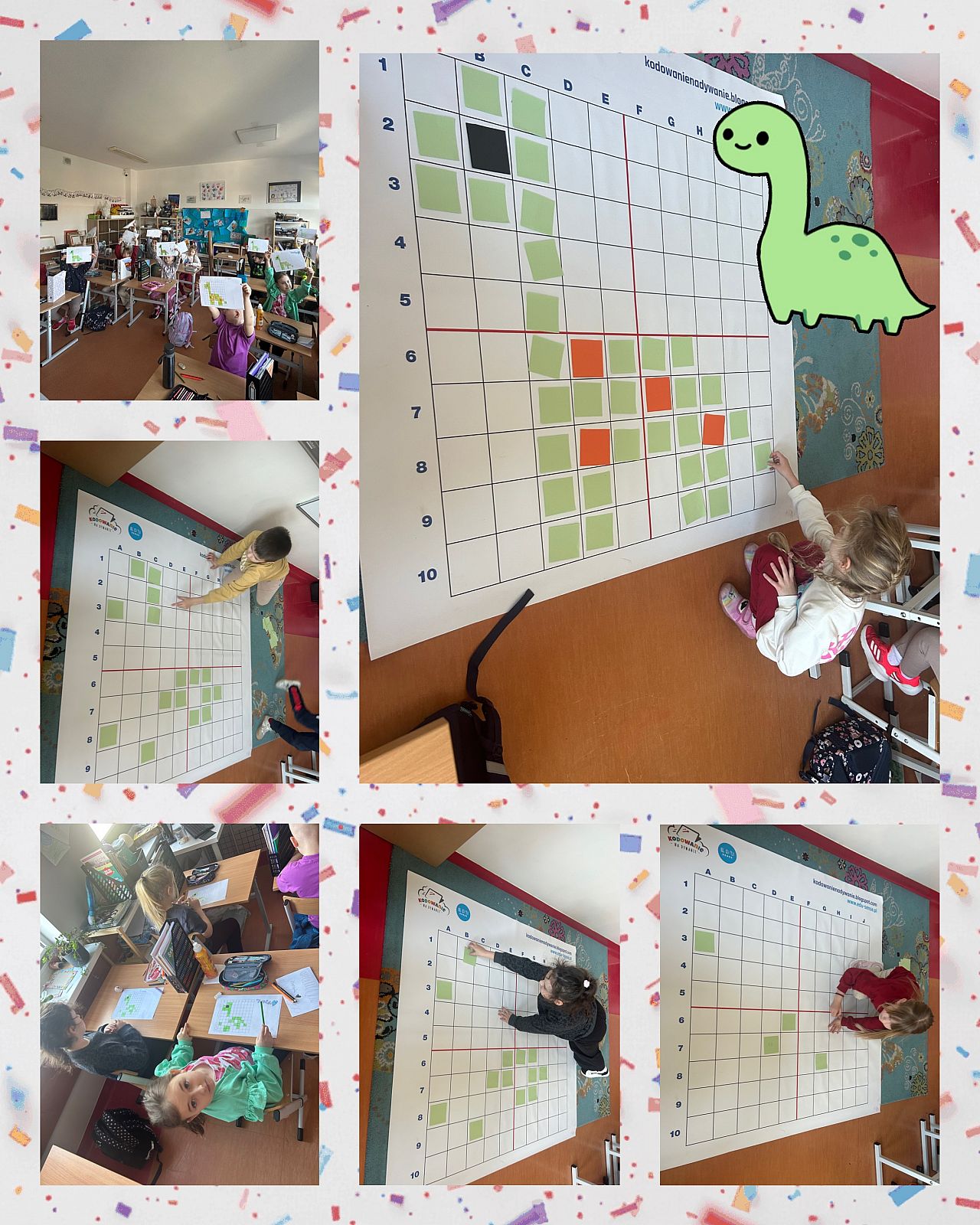 Z okazji Dnia Dinozaura uczniowie klasy 1b pani Ewy Sobańskiej wzięli udział w zajęciach z kodowania. Tym razem ich zadaniem było zakodowanie dinozaura – diplodoka. Dzieci pracowały zarówno na macie edukacyjnej, jak i na kartkach papieru, doskonaląc umiejętność logicznego myślenia oraz współpracy.